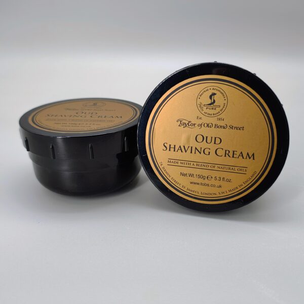 Hochwertige Rasiercreme der Firma Taylor aus London im Tiegel. Mit einem Dachshhaarpinsel aufgeschäumt ergibt es einen cremigen hautfreundlichen Schaum der angenehm nach Oud duftet. Oud hat eine warme, holzige Note mit einem Hauch von Moschus. Gewicht der Rasiercreme 150 gr.